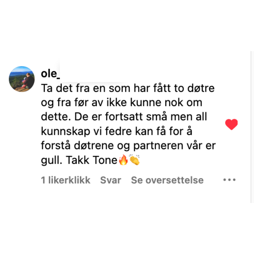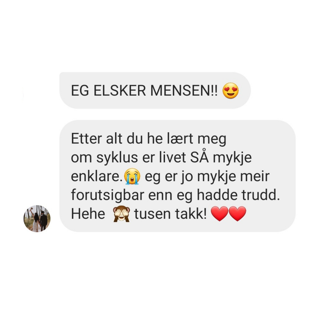 "Blir bare mer og mer fan av deg, altså 👏 Liker at du har et helhetlig perspektiv på kvinnehelse, at du adresserer alt fra psykologiske og fysiologiske til sosiokulturelle aspekter 🔥 Liker at du formidler så mye god informasjon på en personlig og variert måte som kan treffe mange. Takk for alt det positive du bidrar med 🔥"