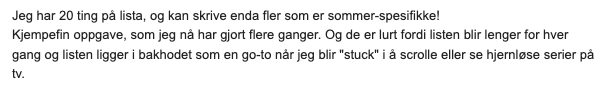 Finn frem penn og papir, og skriv ned minst 5 aktiviteter/ting som gjør deg glad. Det aller viktigste med denne lista er at den SKAL VÆRE SPESIFIKK!